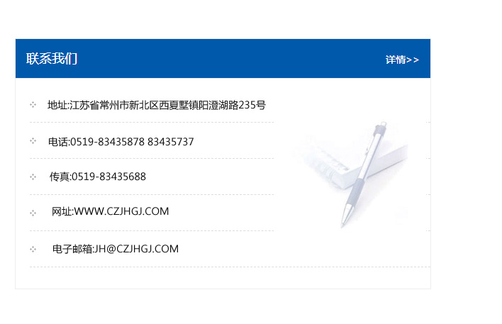 地址:常州市新北區友邦商務大廈1幢16、17層  電話:0519-85101652  傳真:0519-85112595  郵編:213022  網址:www.cz-jiayue_cn.8mak.com  郵箱:xiajifengaa@163.com
